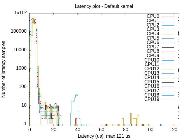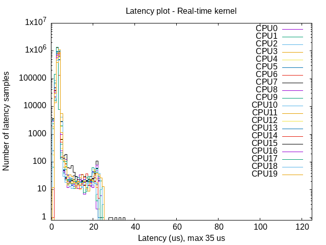 The maximum latency is indicated by the Max value in the output, per CPU core. When using the real-time kernel on the same machine, the maximum latency becomes remarkably smaller and more deterministic.
