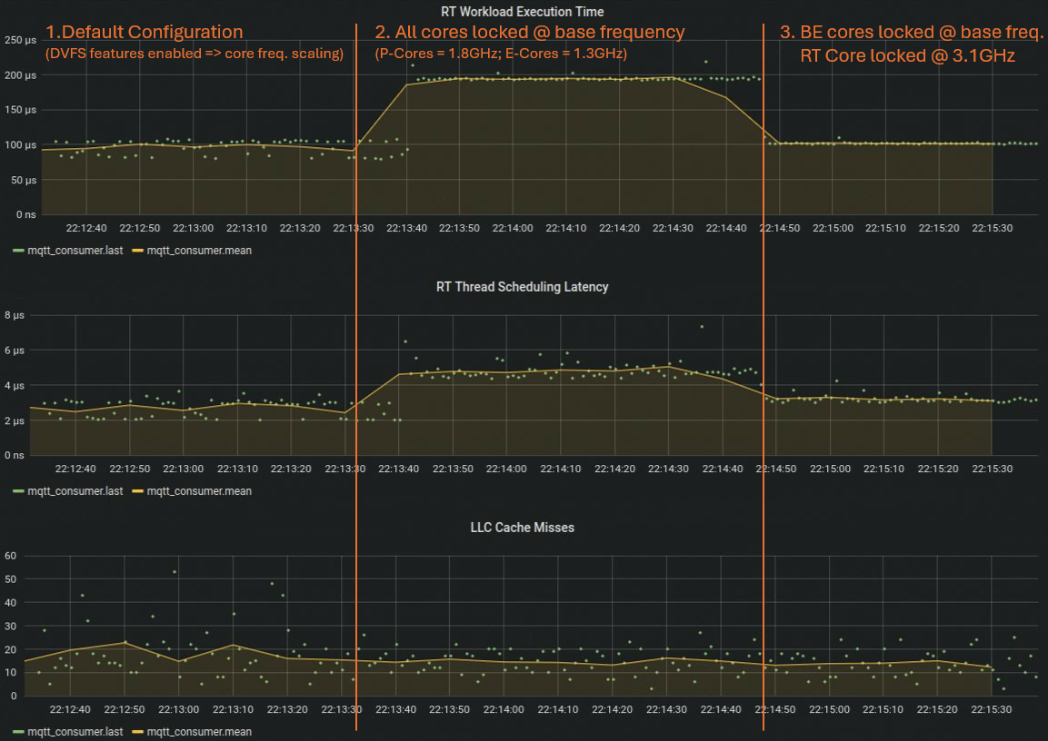 Finally, in step 3, locking the core frequency of the core running the real-time application to a turbo frequency and limiting the maximum allowed frequency of the best-effort (BE) cores to the base frequency, following the guidance of the enveloping configurations listed in the TCC User Guide, results in a narrower execution time jitter band and a significantly lower execution time.